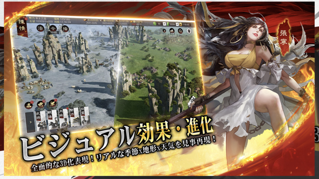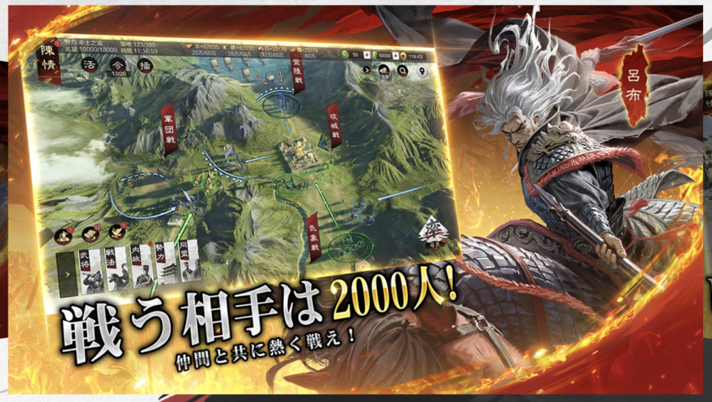 中国全土を再現した広大なマップは、なんと 225万マスこの一マス一マスに資源があり、戦略があります。あなたは一国の主となり、武将を率いて領土を広げ、最終的に大陸の覇権を争うことになります。