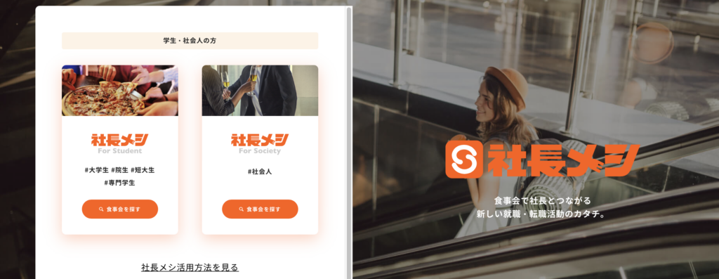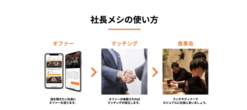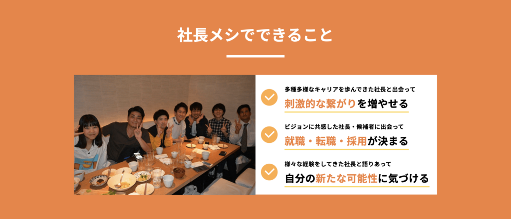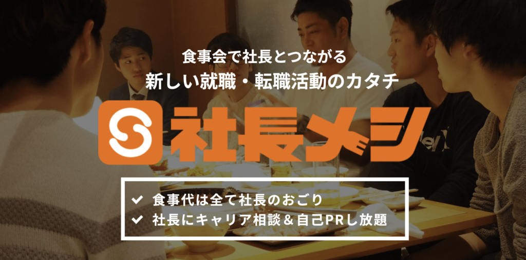「社長メシ」(運営:株式会社ユナイテッドウィル)は、一言で言えば**「経営者と直接つながり、食事をしながら語り合える採用マッチングアプリ」**です。